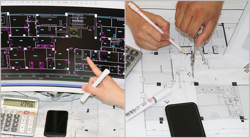 每承接一個工程,公司都會派出經(jīng)驗豐富的技術(shù)團隊上門勘察、實地測量,提供工程設(shè)計方案。測量各個房間尺寸及造型情況,做好記錄,做到心中有數(shù)。